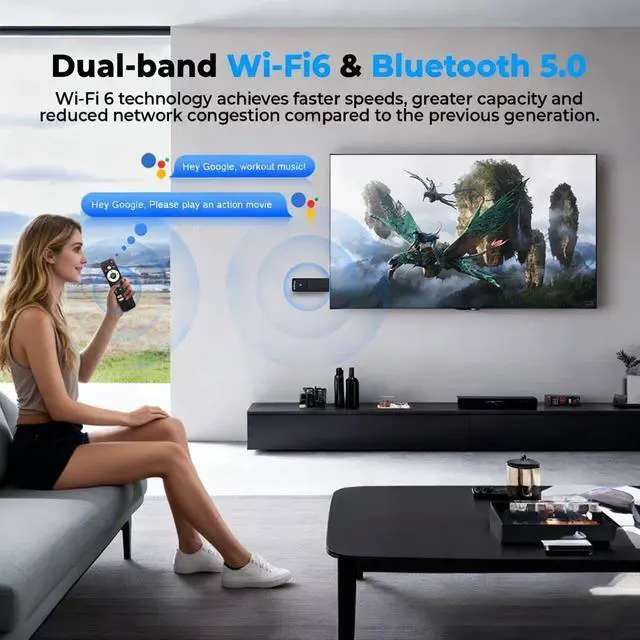 ^^ Powerful PerformancePowered by a powerful processor and dual-band Wi-Fi 2.4 &5G, the tv stick ensures fast, fluid streaming without annoying buffering or lag. Enjoy a smooth and responsive navigation experience, even when switching between multiple apps at high definition. ^^ Massive Content Library & Voice ControlAccess millions of movies, TV episodes, live sports, and music from all your favorite apps like Netflix, YouTube, Prime Video, and more. The included voice remote lets you easily search for content, control playback, and even manage smart tv with simple voice commands.