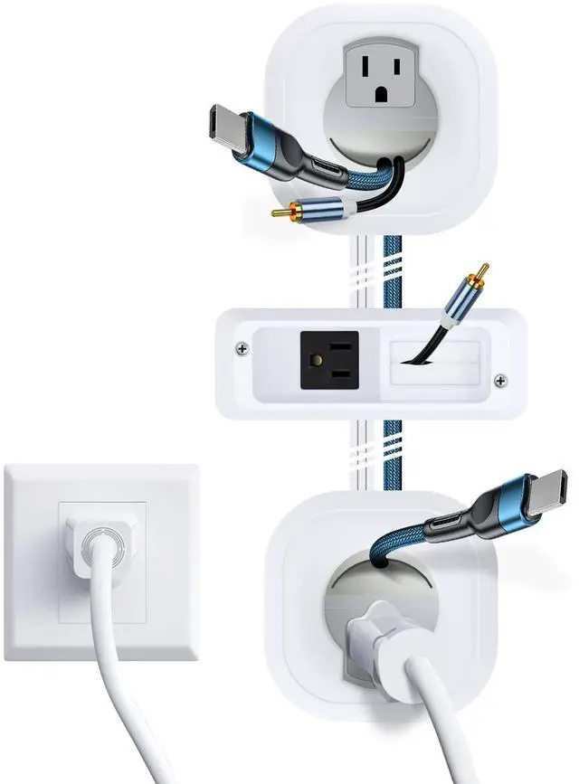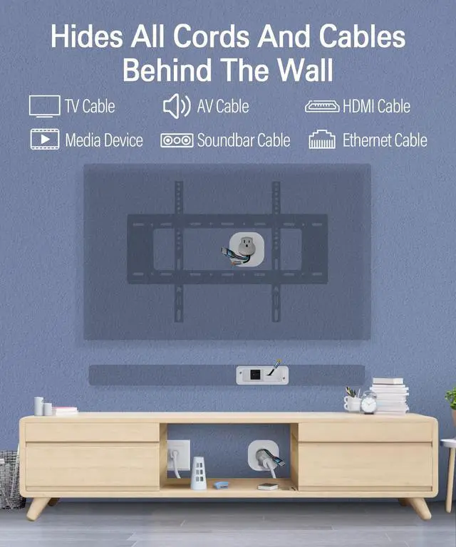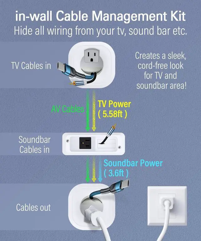 CORD HIDER FOR WALL MOUNT TV AND SOUNDBAR: in Wall Cable Management Kit hide all power, HDMI, video, and audio cables for your wall mounted TV and soundbar setup; Includes pre-wired, in-wall rated power cables - no electrician or hard wiring is required; Creates a neat and clean space once installed; Patent No. US D1041420S ^^