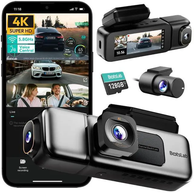 ASIN: B0DT1633D2). ^^ Night Vision + 8s Pre-Recording4K Dash Cam features F 1.8 aperture and 6-element all-glass lens, enhancing nighttime brightness by 300%. With 940nm infrared fill light and WDR, it ensures balanced exposure in backlight or low-light conditions. Botslab Dash Cam is equipped with a G-sensor collision detector, automatically triggering emergency locking upon impact and saving the critical 8 seconds before the incident. Free 128GB card, it fully captures emergency events without missing a moment. ^^ Voice Control + 3.18" Touchscreen Botslab Dash Cam supports voice commandssimply say "Start Recording" or "Take Photo" for hands-free operation, ensuring safer driving! Its 3.18 -inch touchscreen allows quick parameter adjustments and triple-view playback, letting you monitor all angles simultaneously. With multiple operation modes, it delivers enhanced safety and convenience on the road. ^^ Smart Tracking3 Channel Dash Cam features a built-in high-sensitivity GPS chip that accurately records your vehicle's location data and movement trajectory. Paired with [DVplayer] software, it can generate animated driving routes, supporting multi-angle playback and one-click sharing on social platforms. Through the Botslab APP AR-enhanced interface, real-time data like vehicle speed can be overlaid onto the live footage, One-tap sharing.