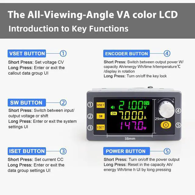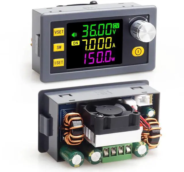 SK150 Buck Boost Converter Parameter The input voltage range is DC 6.0 -36V, the output voltage range is DC 0-36V, the maximum output current is 7A, and the maximum output power is150W. ^^ Full view VA color LCD screenThis product is equipped with a full view VA color LCD screen, providing clear and intuitive display, making it easy for users to view real-time voltage, current, and power values. ^^ Multiple protection functionsAnti reverse connection, anti reverse current, under voltage protection, over-voltage protection, over-current protection, over temperature protection, and over power protection; ^^ Scope of applicationThis is a compact and practical adjustable DC power module.