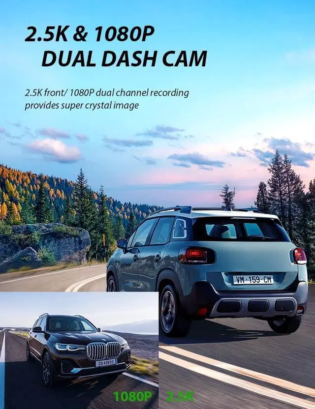 Dual Dash Cam Front and Rear CameraThis dual dash cam records with front 2.5K (2560x1440P@30fps) and rear 1080P (1920x1080P@30fps) resolution. Providing great picture quality and details and performing well in both day and night allowing you to see road signs and license plates. ^^ 2022 Innovative Magnetic MountUnlike the suction cup installation, the unique magnetic mounting of the dash cam keeps it from falling through every bump on the road. Combination with the included static protective film is able to hold the dashcam without issue, even in -10 weather. Super secure, easily removed and replaced.