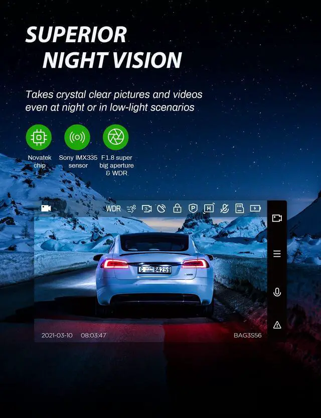 ^^ Intuitive User-friendly InteractThis dash cam has only 4 buttons. All the buttons line up with the menu and it's easy to follow navigational menu and setup. The upgraded USB-C interfaces make installation easier as you can use either port for charging/connection to the rear camera. The large 3 screen has good viewing angles and allows you to easily see what youre doing from setting up the device to reviewing videos. ^^ Super Night Vision Car CameraEquipped with Sony sensor, the dash camera automatically balance light and dark areas of video, will greatly enhance night vision at low light environment, which offers super clear image recording, and provide higher level in-car safety.