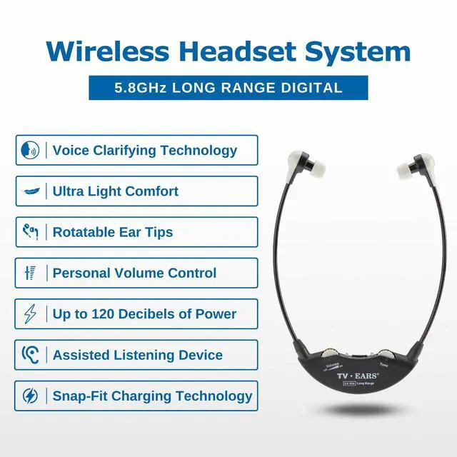 ^^ PRECISE AUDIO CONTROL: Experience unparalleled audio precision with TV Ears cordless headset for TV, designed for seniors and TV enthusiasts. Elevate your TV audio up to 120 dB with ease and enjoy personalized sound tailored to your preferences.