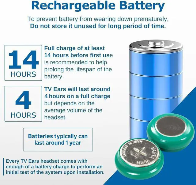 PERSONALIZED AUDIO: Our wireless TV headsets for seniors is your personalized audio that prevents TV volume disputes. Follow key charging tips for prolonged battery life. Enjoy up to 6 hours of use per full charge of TV Ears Genuine replacement batteries.