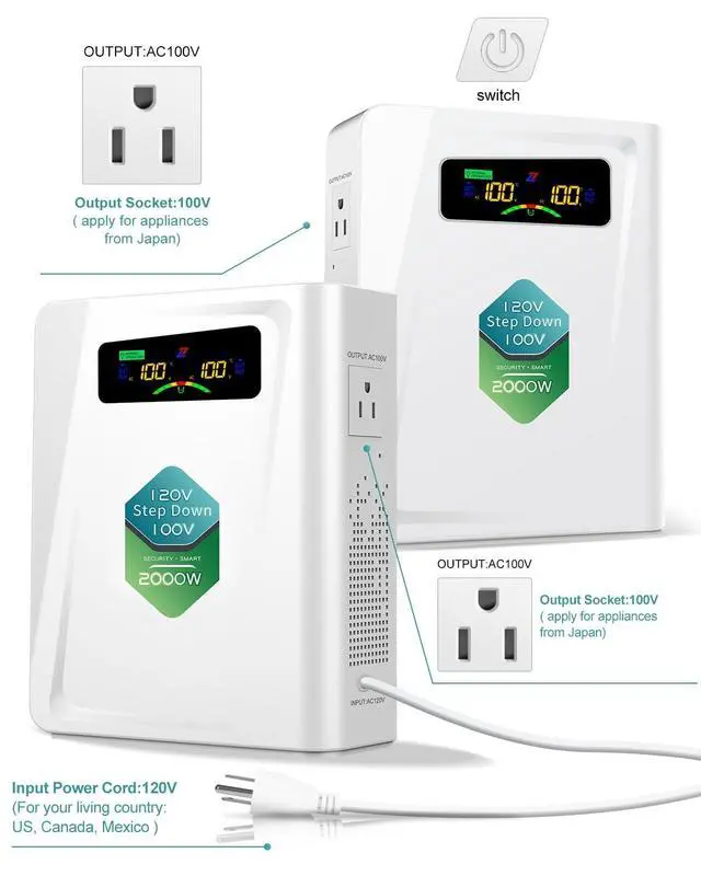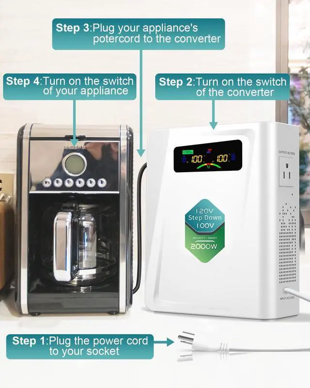 Efficient Voltage Conversion: Our 2000W Step Down Transformer converts 120V to 100V, making it perfect for use with coffee machines, hair dryers, kettles, rice cookers, and other Japan appliances.