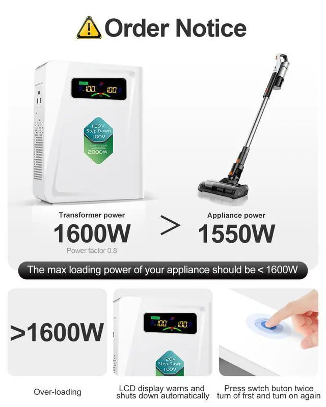 ^^ Easy to Use: To ensure safety, we recommend using appliances not exceeding 1600W with our transformer. Simply check the power and voltage of your appliances before purchasing and contact us if you have any questions during use.