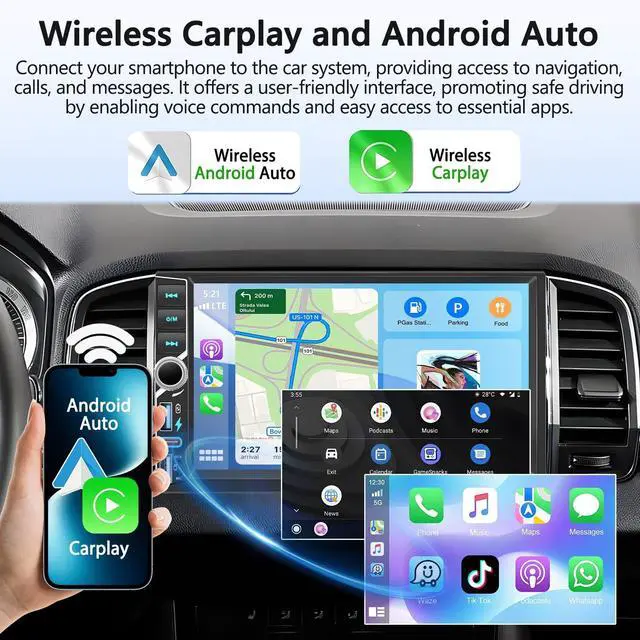 Wireless CarplaySeamlessly connect your mobile phone to access a wide range of features including the address book, mail, notifications, map navigation, music, videos, and more. With the Wireless Carplay, you can easily control these functions using voice commands, making your driving experience safer and more convenient. Whether you prefer the convenience of wireless connectivity or the reliability of a wired connection, our system offers the flexibility you need! ^^ Wireless Android AutoDesigned to seamlessly integrate your Android phone with your cars player, this cutting-edge technology allows you to effortlessly navigate, make calls, send and receive messages, and listen to music, all without the hassle of a data cable connection.