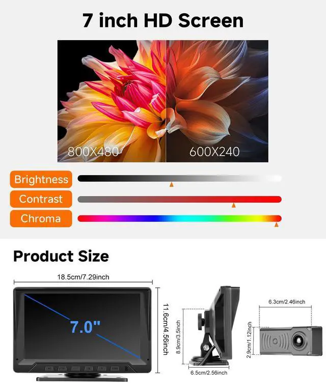 Wide range of vehicles: 7-inch HD touch key monitor features responsive control and clear display for easy operation. Universally compatible with sedans, SUVs, trucks, trailers, campers, RVs, and vansseamlessly integrates for enhanced safety across all vehicle types