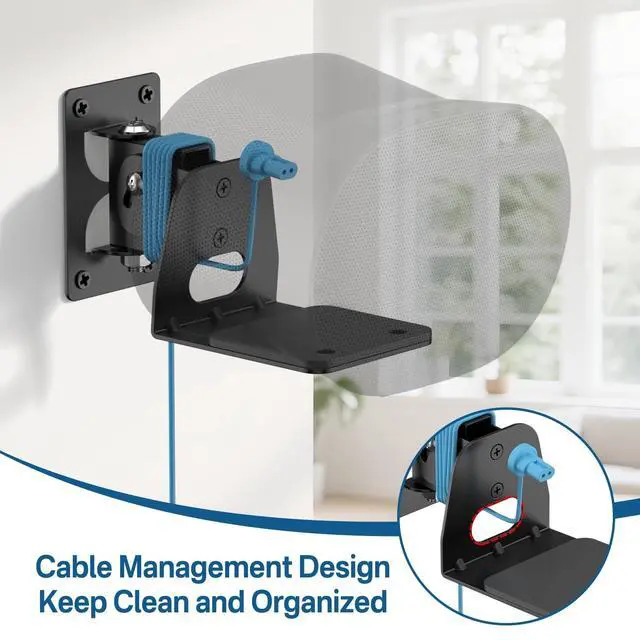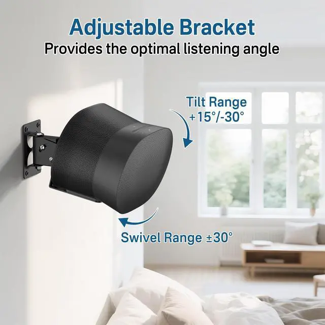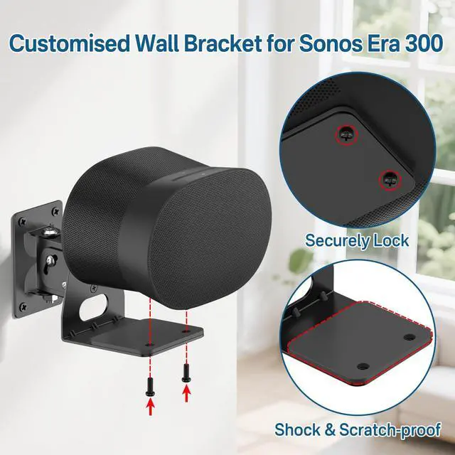 Perfect For Sonos Era 300 Compatibility - Engineered exclusively for Sonos Era 300 wall mount, this wall mount features precision screw holes that perfectly align with your speaker's base. The reinforced locking mechanism ensures zero wobbling, providing security for your premium audio equipment in living rooms, home theaters, or studio setups. ^^ Professional-Grade Adjustability - The speaker braket for Sonos Era 300 wall mount swivel features +15/-30 tilt and 30 swivel capabilities for ideal sound positioning. Whether you're creating Dolby Atmos immersion in home theaters or optimizing acoustics in recording studios. ^^ Cable Management Design - The wall mount for Sonos Era 300 speaker wall mount has specially designed holes for managing the speaker cables.