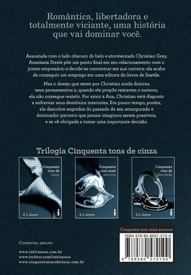 Assustada com os segredos obscuros do belo e atormentado Christian Grey, Ana Steele poe um ponto final em seu relacionamento com o jovem empresario e concentra-se em sua nova carreira, numa editora de livros. Mas o desejo por Grey domina cada pensamento de Ana e, quando ele propoe um novo acordo, ela nao consegue resistir. Em pouco tempo, Ana descobre mais sobre o angustiante passado de seu amargurado e dominador parceiro do que jamais imaginou ser possivel. Enquanto Christian tenta se livrar de seus demonios interiores, Ana se ve diante da decisao mais importante da sua vida.