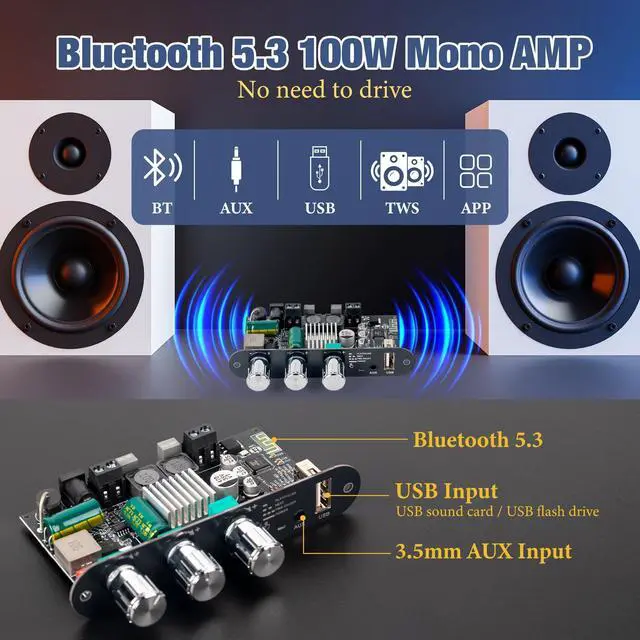 Wireless Stereo Pairing: Easily sync two amplifier boards via one-click TWS pairing to create immersive left/right channel stereo sound. Perfect for building wireless speaker systems with seamless dual-board synchronization. ^^ Bluetooth 5.3 + Triple Input Modes (USB/AUX/PC