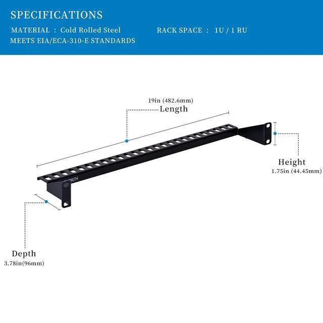 The RackPath cable management cross bar is a great solution to organize and support cables in your rack or cabinet. It can easily organize cables from the front or back of your 19-inch server rack. The pass - through holes helps to route your cables and reduce tension on equipment ports. Properly routing cables also improves airflow in your server rack and enclosure, which helps to keep your equipment from overheating. Constructed from high-quality cold rolled steel with a durable black electro-static powder coated finish, this cable management cross bar provides durability and functionality.