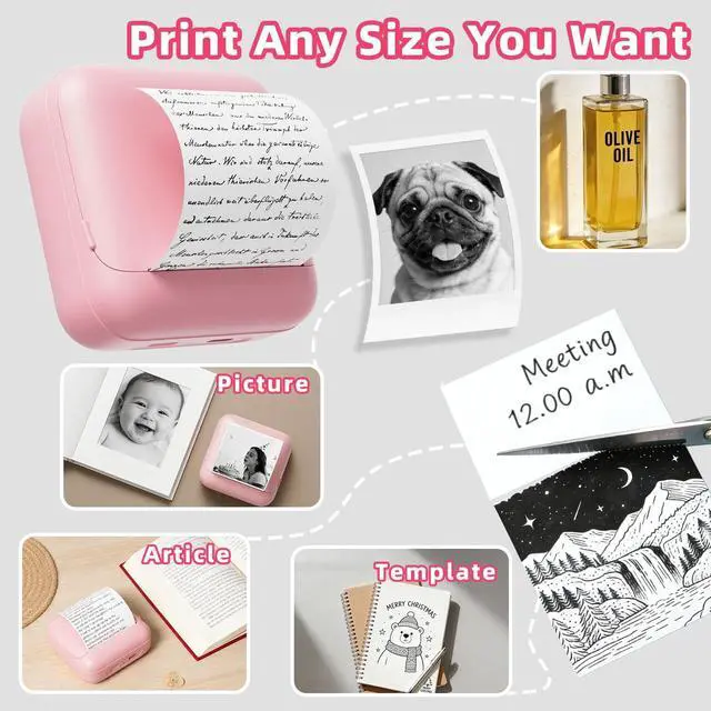 Great Printer for Your LifeThis new-style inkless pocket printer prints pictures, memos, lists, notes, and more. As a mini sticker printer, it helps decorate journals, style photos, organize study notes, and capture happy moments anytime. It's the perfect gift for kids, students, teachers, and DIY enthusiasts on holidays like Christmas, Children's Day, and Thanksgiving. ^^ Welcome to the Ink-Free Era With advanced thermal printing technology, this device requires no ink whatsoever. Print your favorite images and any content you desire anytime, anywhere.