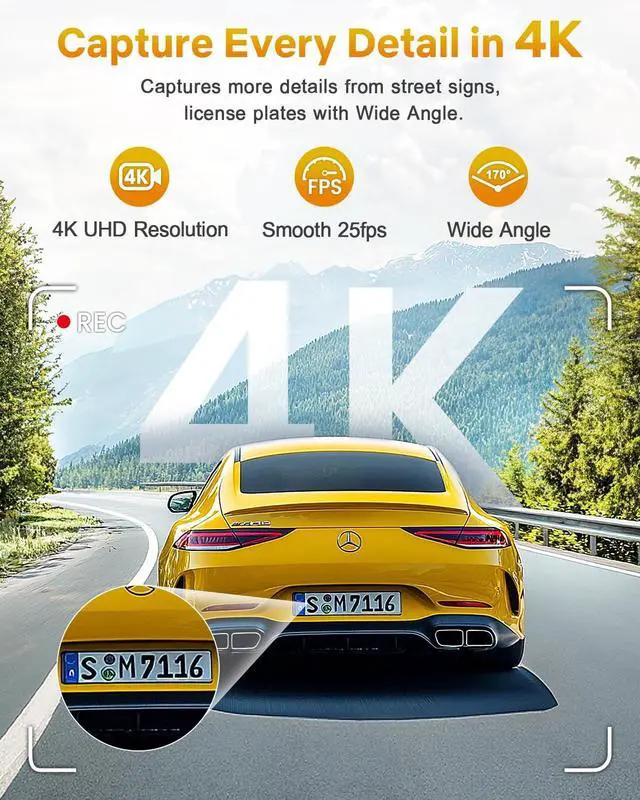 Crystal-Clear 4K Front-Only Dash CamExperience ultra-clear 4K resolution that brings every drive to life with incredible clarity. Ready to record right out of the box with a FREE 64GB SD card included! The 170 wide-angle lens expands and captures more of what matters, featuring 6-glass optics and an F 1.8 aperture to clearly document every moment behind the wheel. This dash cam is your reliable eye on the roadready to deliver critical evidence when it counts. ^^ Built-in WiFi & App ControlThis dash cam features built-in WiFi and must be used in conjunction with the dedicated Free app to establish a connection.