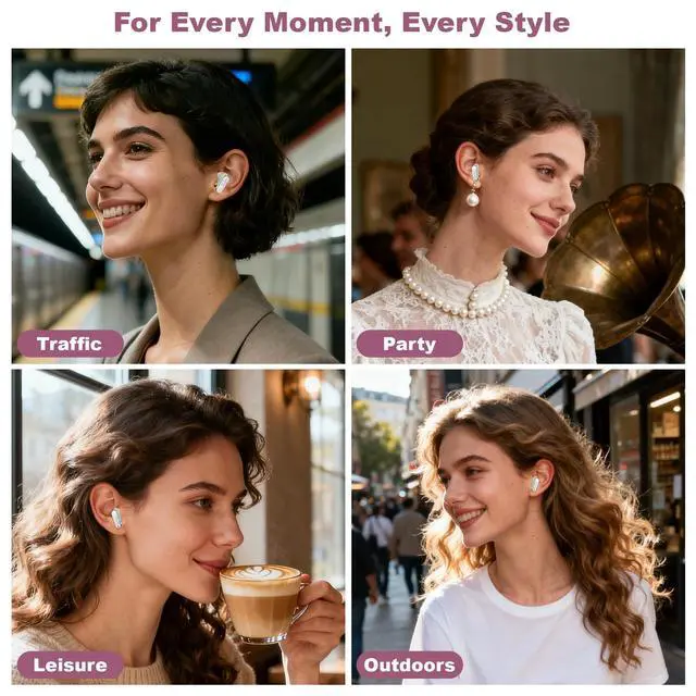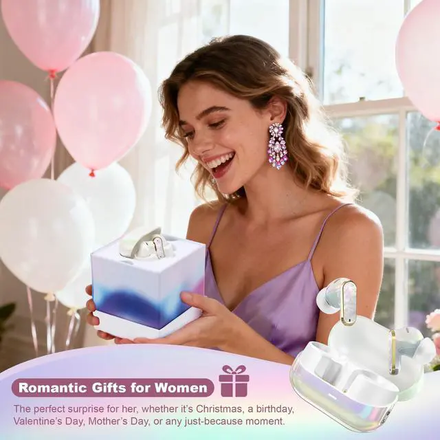Perfect for travel, work, or relaxing whether youre on a crowded subway or in a quiet coffee shop. ^^ All-Day Comfortable Wireless EarbudsSay goodbye to ear fatigue. These in-ear headphones are super lightweight at only 3.2 g each. and come with three pairs of soft silicone ear tips in different sizes, so you can find the perfect fit for your ear shape. The ergonomic in-ear structure ensures a secure, pressure-free feel that stays comfortable through long listening sessions, workouts, commutes, or travel. ^^ Jewelry-Inspired Earbuds That Create the Wow MomentThe moment she sees these wireless earbuds, the jewelry-inspired design makes an instant impressionelegant, stylish, and personal.
