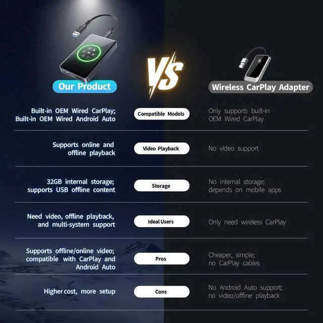 Use: Simply ensure your car is equipped with a wired CarPlay and Android Auto system, connect the vehicle's data port, and you're ready to go. This product is not compatible with cars that have wireless CarPlay or Android Auto systems. If you're unsure whether your car model is compatible, feel free to contact me anytime.