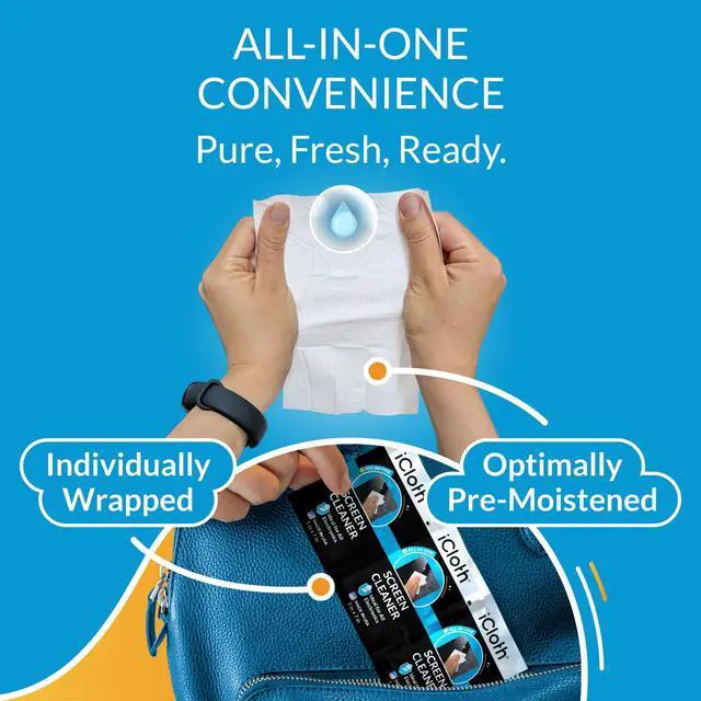 PERFECT FOR SCREENS & ELECTRONICS iCloth wipes effectively clean all types of screens with an ultra-pure formula of deionized water and isopropyl alcohol (IPA), ensuring no damage to sensitive coatings on smartphones, tablets, laptops, computer monitors, car touchscreens, and other electronics. ^^ STREAK-FREE AND SPOTLESS CLEANING The formula evaporates quickly, leaving your screens crystal clear with no streaks or residue. ^^ LINT-FREE AND SCRATCH-FREE MATERIAL Made with hydraspun non-woven fabric, iCloth wipes are durable, soft, and lint-free, ensuring a gentle and flawless clean. ^^ INDIVIDUALLY WRAPPED FOR CONVENIENCE Each wipe is pre-moistened and hermetically sealed to stay pristine until use, making it perfect for travel.