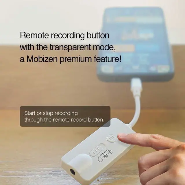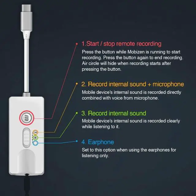Provides cleaner internal sound recording with digital sound recording. Records rich audio producing stereo sound. ^^ If your phone USB is Micro USB, you have to purchase *Mobizen OTG Gender (C type to Micro USB). *Search for Mobizen OTG Gender in the search box and purchase it. ^^ Remote recording button with the transparent mode, a Mobizen premium feature! (You won't see the Air Circle while recording. ) ^^ Internal sound recording without earphones! ^^ Start or stop recording through the remote record button.