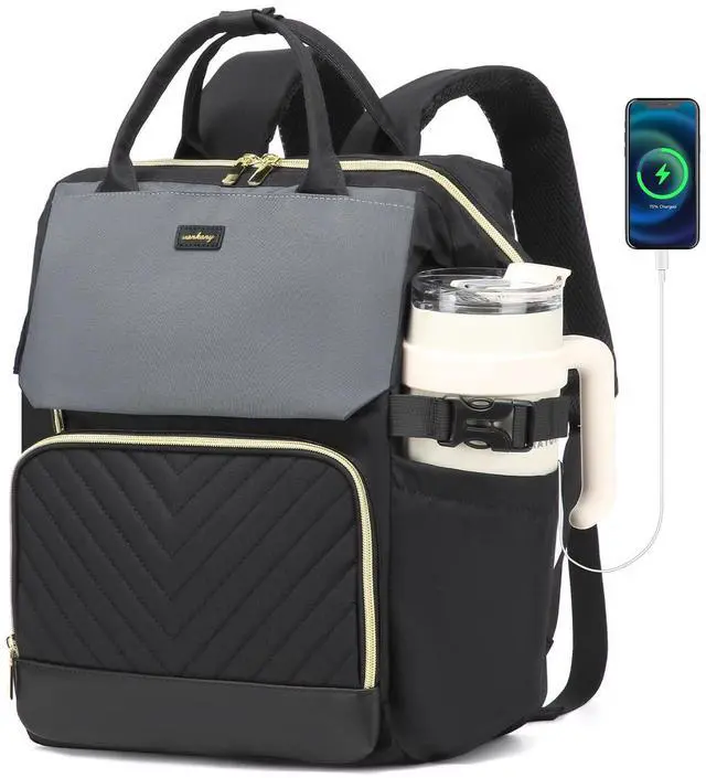 VANKANY Computer Backpack for Women, Work Bag Laptop Bookbag with Cup Holder & USB Charger for Teacher Nurse College Travel Back Pack, Gifts, Black Gray