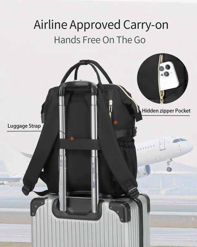 Travel Friendly: Airport Approved Size. The luggage sleeve allows backpack fit on luggage/suitcases by sliding over the upright handle tube for easier carrying. Have a hidden pocket on the back side, which is great for your passport or wallet to keep it out of reach or pickpockets! It has padded straps for shoulder comfort. Top handles allow for easy grabbing ^^