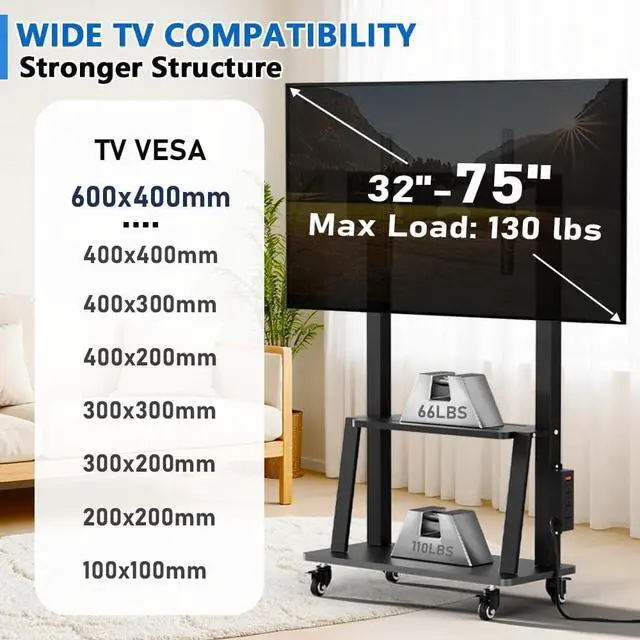 Sturdy & Compact TV Cart: Our mobile TV stand are prepared for most TV brands and types including large screen & premium TV. This TV stand with wheels fit most 32 to 75flat screen/curved TVs with a maximum TV weight capacity of 130lbs, plus safety screw as an additional security. Dual-tier storage design can hold up to an remarkable 66lb upper shelf and 110lb lower shelf for your equipment, provides a stable and safe platform for laptops, media players, sound bar, and game consoles. ^^ Portable TV stand with