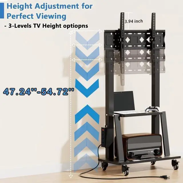 Power Outlet: This Duiliuu TV cart is equipped with a built-in power outlet with 4 AC outlets (125V/12A) and a 6.5 ft power cord for easy connection to a wall outlet to say goodbye to messy wires, and a one-button switch that turns it off when not in use, which can prevent children from touching it and other problems effectively.