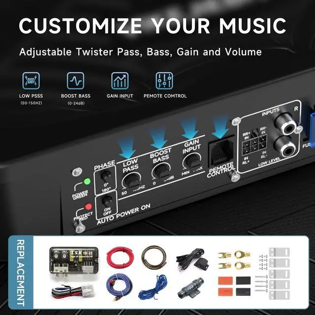 ^^ [Customize Your Music] This subwoofer features independent knobs for adjusting the low-pass filter (50Hz-100Hz), bass boost (0-24dB), gain input (min-max), and volume. Let every song dance to your unique vibe and rhythm. ^^ [Car Subwoofer Specifications] --