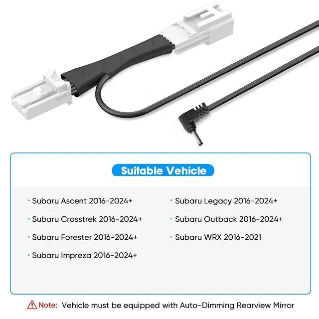 Clean Install Plug and Play This Radar Detector GPS power adapter is gets power from the auto-dimming rearview mirror to power the radar detector, super easy to install, plug and play, perfectly hidden behind the rearview mirror camera. ^^ 5P Type E Radar Detector Power AdapterIf your car model is not listed in the picture, you can check the number of pins and the appearance of your car's connector, and it may be compatible with other makes and models of cars, the same connector with different wiring method is suitable for different models, please confirm the model and check connector port before purchase! ^^ Applicable ModelsThis radar detector power adapter is suitable for select Subaru Outback 2018, Ascent/ Crosstrek 2021-2023, Forester 2021-2024, Legacy 2016, Impreza 2020, and more with auto-dimming rearview mirror! ^^ NoteThe radar detector adapter is recommended for radar detector requiring 12V 1A for optimal heat performance.