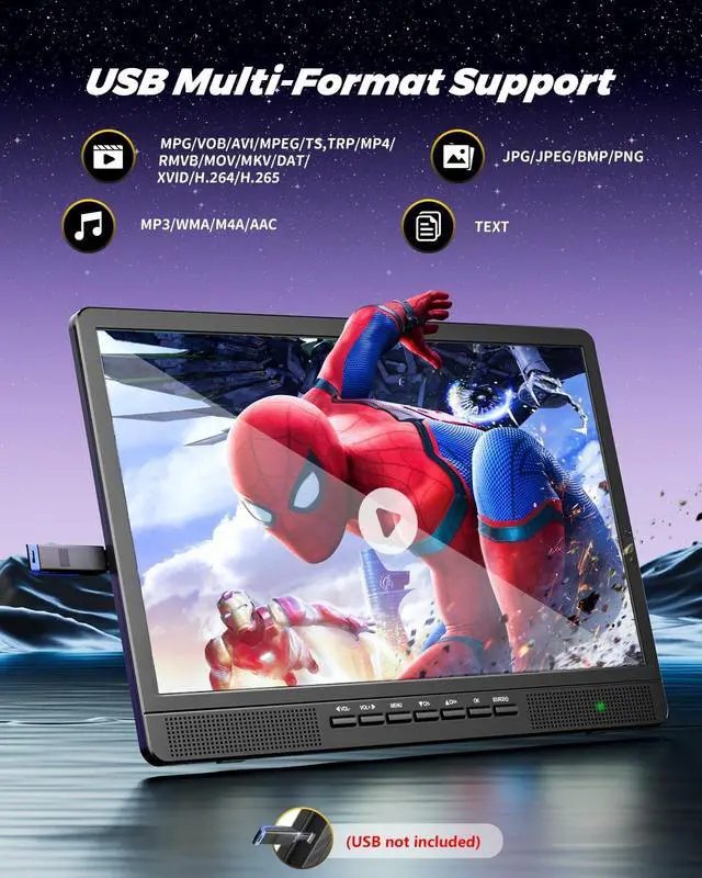 Inputs & Formats: Built-in HDMI, AV, and USB input ports, this portable tv allows connection to various devices such as phones, computers, TV sticks, Raspberry Pi, Xbox, kindle fire, gaming consoles, DVD players for multimedia playback. USB input are capable of syncing external devices with 1080P video (AVI, MPG, MOV, MKV, MP4, TS, VOB, DAT), audio (MP3, WMA, M4A, AAC), picture (JPG, JPEG, BMP, PNG), and text formats ^^ 180