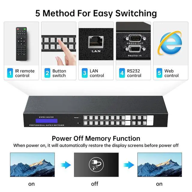 Input Transmission up to 49FT, Output Transmission up to 65FT. ^^ [ ] This HDMI Matrix Switcher allows switching by 1) Panel Button, 2) IR remote, 3) LAN, 4) RS232, 5) Web GUI. The Backlit Button is vision-friendly and easy to operate. The LCD Info Screen allows to check out matrix status and information. It can also control by Phone App with Android system. ^^ [? ]