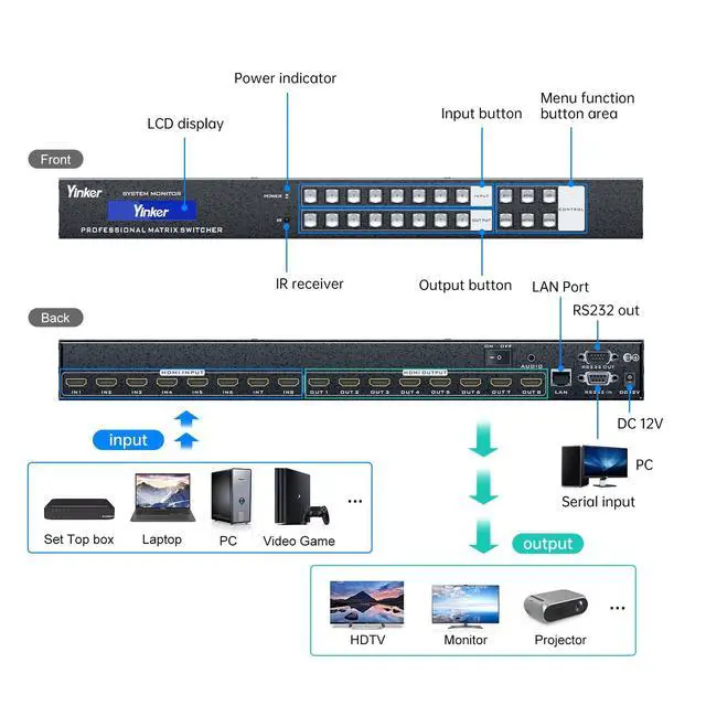 Package includes: HDMI Matrix x1, RS232 Cable x1, IR Remote x1, User Manual x1, US Power Adapter x1. Any questions or problems, you are welcome to contact YINKER OFFICIAL for support.