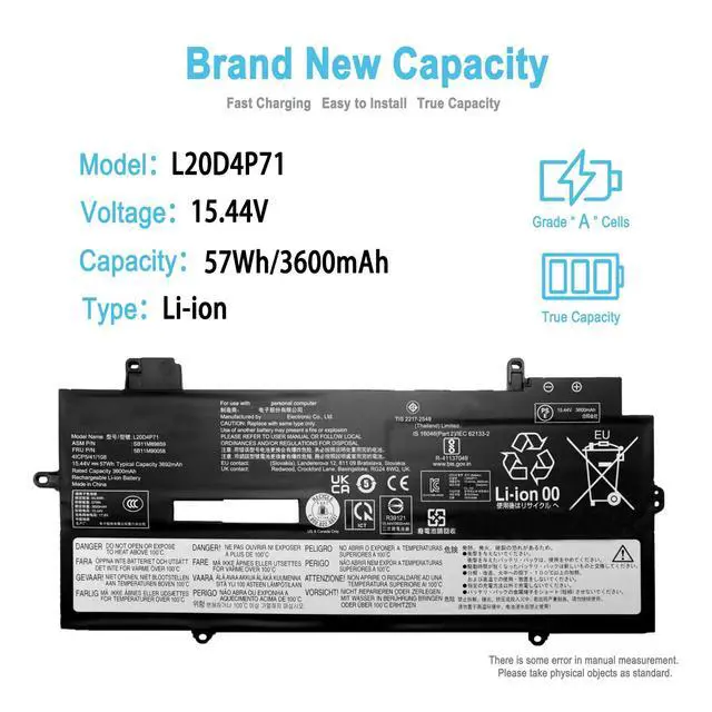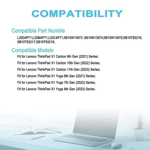 Condition: 100% brand new from manufacturer. ^^ Replacement Battery Part NumbersL20D4P71; L20M4P71; L20C4P71; 5B10W13973; 5B10W13974; 5B10W13975; SB10T83216; SB10T83217; SB10T83218; ^^ Compatible ModelFit for Lenovo ThinkPad X1 Carbon 9th Gen (2021) Series; Fit for Lenovo ThinkPad X1 Carbon 10th Gen (2022) Series; Fit for Lenovo ThinkPad X1 Carbon 11th Gen (2023) Series; Fit for Lenovo ThinkPad X1 Yoga 6th Gen (2021) Series; Fit for Lenovo ThinkPad X1 Yoga 7th Gen (2022) Series; Fit for Lenovo ThinkPad X1 Yoga 8th Gen (2023) Series. ^^ After-Sales SupportWe support 30 days refund, 12 months warranty (refund or replace battery), 24 x 7 mail support. return window will close one month after you receive the product and you can contact us by placing your order or by clicking " Ask a question" on the seller's page.