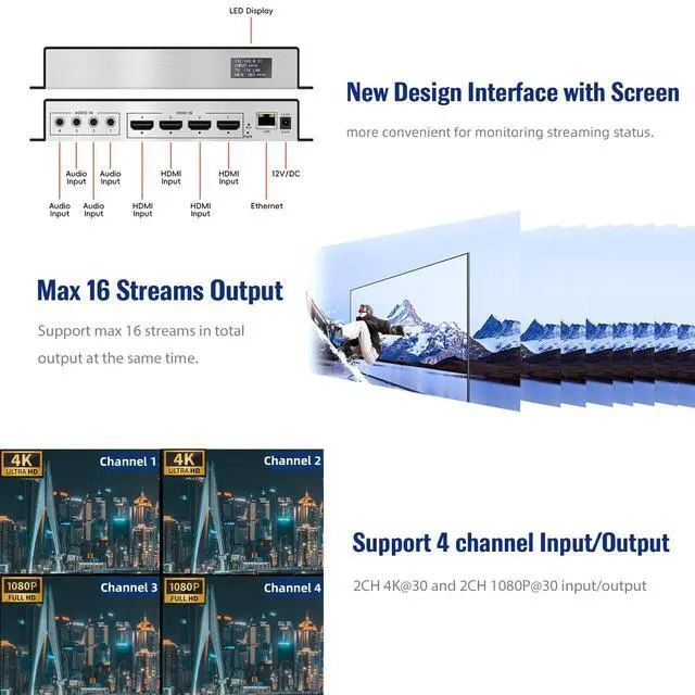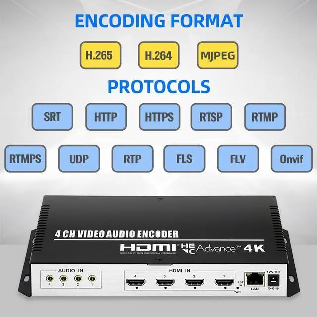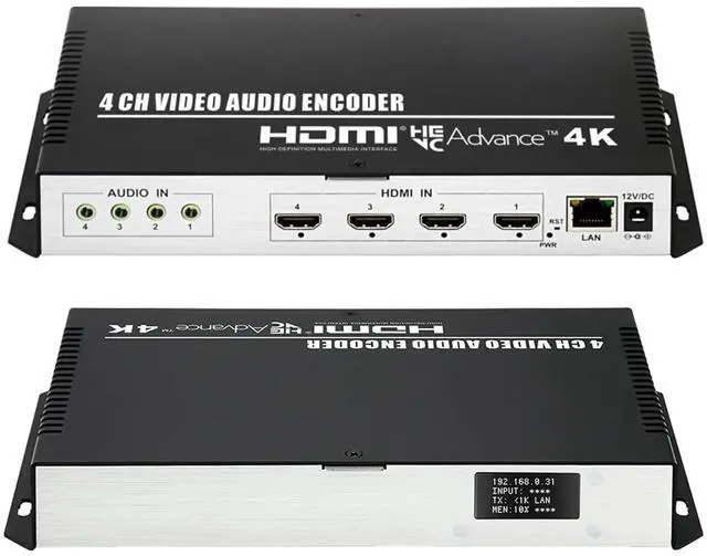264 encoder has 4 HDMI input interfaces and 4 external audio input jack, 1 Ethernet output port. H. 265 encoder supports 4 channels HDMI input & output. Each channel can be used to broadcasting for up to 4 platforms with the same or different(http, rtsp, udp, hls) protocols. So hdmi encoder can simultaneously do live broadcasting to 16 platforms at the most. ^^ Max Resolution 2CH 4K@30HZ +2CH 1080P@60HZIPTV video encoder for live broadcasting supports real 4Kp30 HDMI input and encodes up to 4Kp30. IPTV encoder can meet your needs for a high-quality image, support up to 2CH 4K@30hz and 2CH 1080P60 resolution input & output.