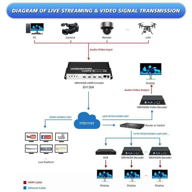 ORIVISION R&D Leading AdvantageThis ORIVISION video encoder is the latest lanunched encoder for live broadcasting, and also for other use like CATV digital head-end, hotel IPTV system, broadcasting media server etc. It supports H. 265 H. 264 MJPEG. Extra LCD screen help you monitor the working status in real time. It works well with regular online broadcasting platform like Youtube, Facebook Live, Twitter, WOWZA, Twitch etc. This new encoder has RTMP built-in server. ^^ 4 Channel Input/Output & Max 16 Feeds Output Same TimeH. 265 MJPEG H.