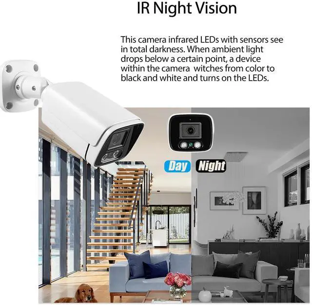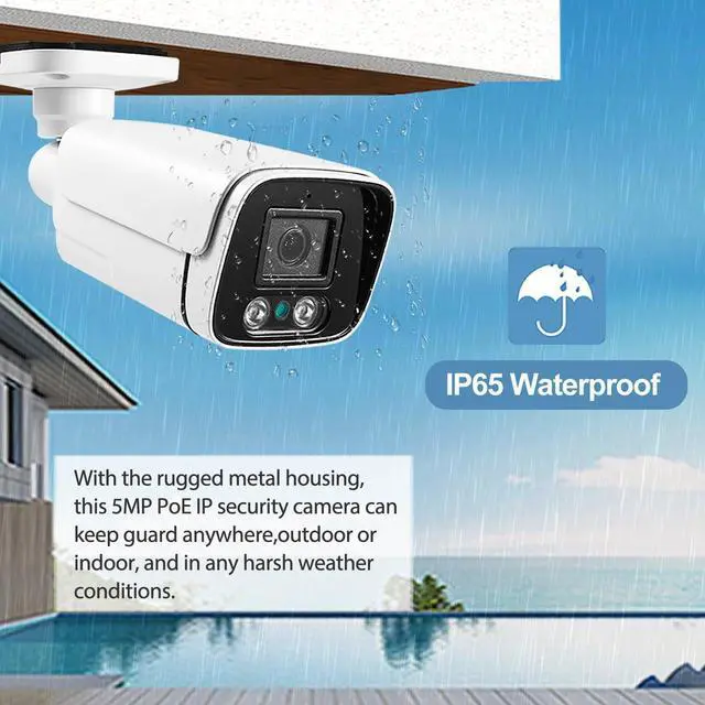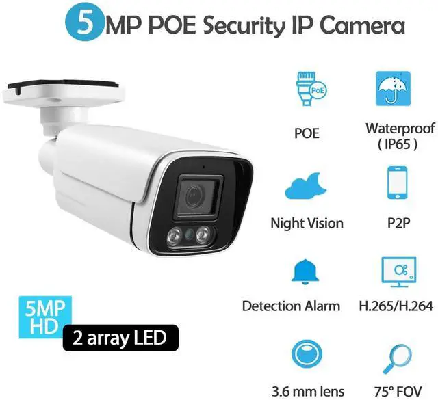 Support POE and DC Support 48V 802.3 af POE (Power over Ethernet) function, reducing wiring trouble. And it also has an auxiliary power supply interface, which can be powered by ordinary 12V 2A power supply and used as a non-POE network camera. ^^ HD 5MP (2880*1616P) Resolution This IP camera captures clear and smooth images/videos with a high resolution of 5.0 megapixels, allowing you to view detailed images with clearer images. ^^ Save storage space, H. 265/H. 264 dual encoding Compatible with H. 264/H. 265 dual encoding, compared with H.