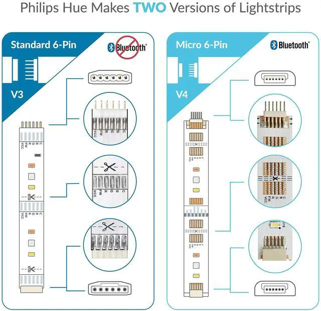 makes two lightstrip versions: Standard 6-Pin V3 which has larger pins (compatible with the WiZ and Hue v3 lightstrip) and Micro 6-Pin V4 which has smaller pins (compatible with the Solo and Hue v4 Lightstrip). Check the comparison image which shows both connector types to confirm before purchasing.