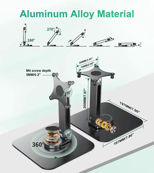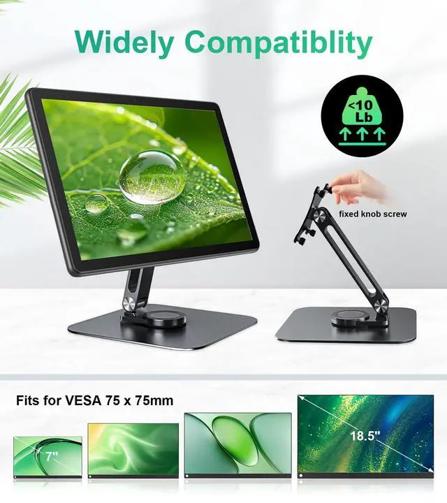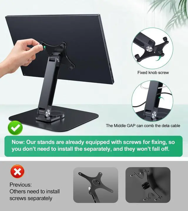 Anti loss fixing screw design fits perfectly for our brand's monitors ^^ If your small monitor, digital photo frame weighs less than 5kg/ 6.6 lbs, has 4pcs M4 screw holes, and the VESA pattern distance is 75x75mm, it can also be perfectly compatible with our stand ^^ The stand base supports 360 horizontal rotation, the monitor arm supports 270 side angle adjustment, and supports 180 vertical angle adjustment. The stand has firm stability, anti-slip function, and it can also raise your monitor to a better adjustment viewing angle, allowing your neck and back to maintain a better posture when working at a desk for long periods of time.