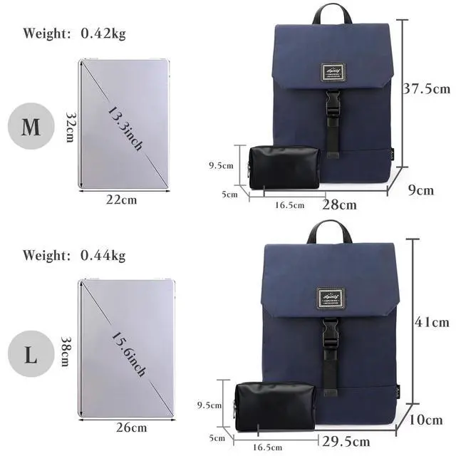 Weight: 0.42 (M) / 0.44 (L) kg. With 1 main pocket, 1 front pocket, 2 inner patch pocket, 1 shockproof laptop compartment(up to 14 (M) / 15.6 (L) inch). Large backpack can easily store books, notepads, laptop, power bank, water bottle, etc.