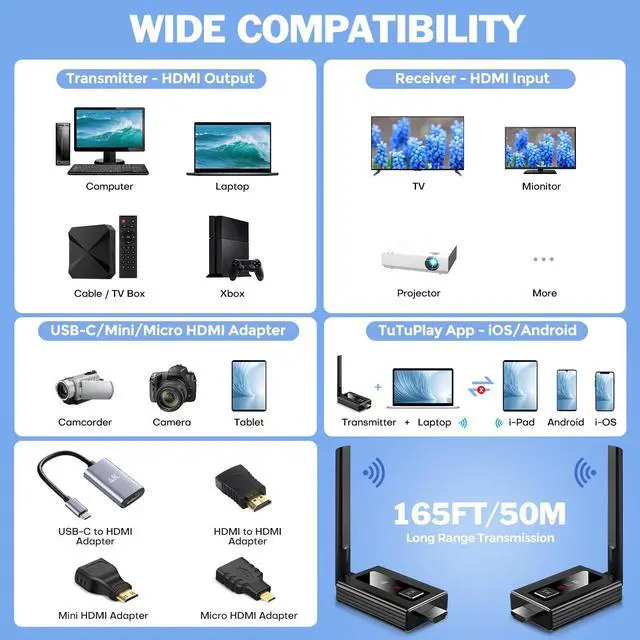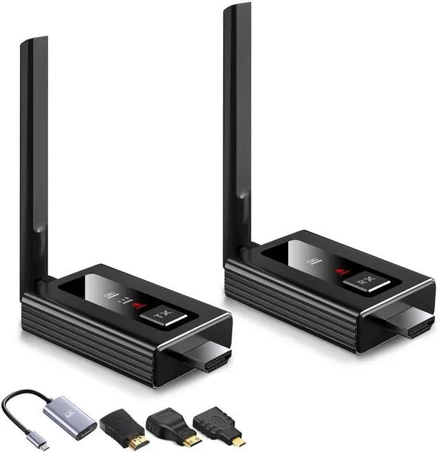 Package Includes: 1 x Transmitter, 1 x Receiver, 2 x USB-C Cable, 2 x Antenna, 1 x HDMI Extension Cord, 1 x mini HDMI to HDMI Adapter, 1 x Micro HDMI to HDMI Adapter, 1 x HDMI to USB-C/Type-C Conversion Cord, 1 x User Manual. Due to the different monitor and light effect, the actual color of the item might be slightly different from the color showed on the pictures. Thank you!