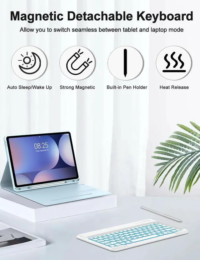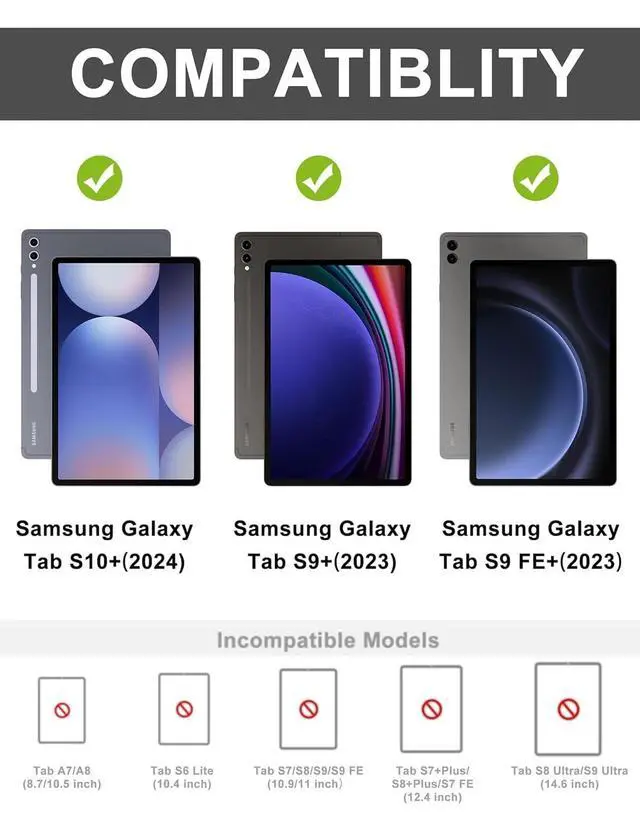 Easy of Use / Galaxy 12.4 inch Tab KeyboardTransform your tablet into a powerful productivity tool with our tablet keyboard case for samsung galaxy. This teclado galaxy tab s10plus offers a seamless typing experience. Keyboard FunctionallyMagnetically detachable super slim 5mm and light weight bluetooth keyboard with 10M range. And the book cover keyboard tab s9 fe + with strong magnetic keyboard gives you a stable platform for typing that won't move easily. Stylus Pen HolderThis touch keypad for galaxy case is designed with pen holder, grab your pencil effortlessly whenever you want, easily to carry your pencil with your device.