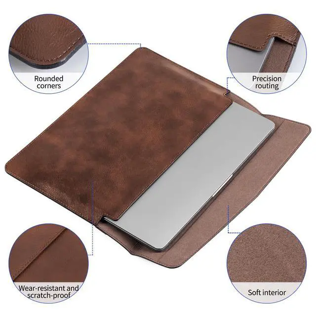 The exquisite stitching on the flip cover is not only firm but also adds a touch of handcrafted beauty. ^^ Scratch-resistant and wear-resistant - The inner lining is made of soft microfiber material, providing velvety care for your MacBook screen and body, effectively preventing scratches and bumps during daily use. ^^ High-quality cowhide, Light and Portable - Made of high-quality cowhide, it is light in texture and durable. With use, the leather will gradually develop a unique retro luster, accompanying you through every important moment. It is an ideal choice for students and commuters.