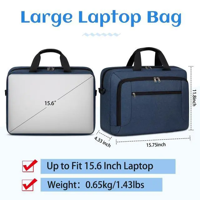 of large laptop bag: 15.75 * 11.8 * 4.73, weight: 1.43 lbs. 3 main compartments to meet all your needs well. The main tech compartment can fit 15.6 inch laptop (up to 15.6 inch) and 12.9 inch iPad. 1 Front large easy access pocket with 4 slots for magazines, textbooks, paper, kindle, wireless mouse, pens, passport, wallet, etc. 1 Front small pocket keep your small items like keys, change purse, tissue, etc. ^^ Durable &