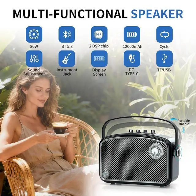 [High-Fidelity Audio with Deep Bass] The SUPNIU L200 portable bluetooth speakers equipped with a 80W (120W Peak) output powered by features the latest 3 drivers and Dynamic Diaphragmadopted dual professional digital processor processing DSP chips and high-low pitch separation technology to adjust the sound effect, fully releasing the characteristic advantages of treble and bass, intelligently eliminating noise, making the sound clearer, the bass stronger and the volume more moderate. The bass is so rich and deep that you even can feel the vibrations. ^^ [Designed for Multifunctionality with Long-Lasting Performance] Designed for both home and outdoor entertainment, this portable boombox speaker delivers 120W Peak of powerful sound.