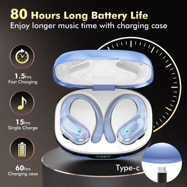 HAOYUYAN Wireless Earbuds, Bluetooth Headphones, Ear Buds with 80hr Playtime, LED Power Display, Noise Canceling, LED Power Display, IPX7 Waterproof Earphones for Gym/Workout/SportBlue