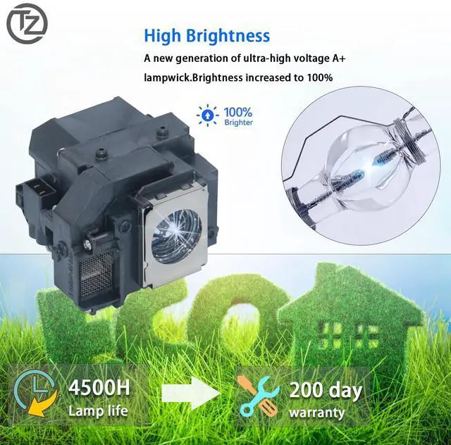 Compatible modelFit For EPSON Power Lite Home Cinema 705HD Power Lite S7 W7 S8+ EB-S7 EB-X7 EB-S72 EB-X72 EB-S8 EB-X8 EB-S82 EB-W7 EB-W8 EB-X8e ex3200 ex5200 ex7200 h368a eb-w9 eb-x10 eb-x92 s10+ vs200 s9 EH-TW450 EX31 EX51 EX71 H309A H328B Movie Mate 60 Movie Mate 62 Projectors. ^^ This replacement projection bulb comes with Housing. It is very easy to install and everyone can do it. ^^ Complete Renewal, Brighter Upgrade, Long-lasting Durability A Brand New Experience, Beyond the Past ^^ Ensure full compatibility, high-brightness and clear image output. The lifespan is 4500 hours, and the ECO mode has a longer lifespan.