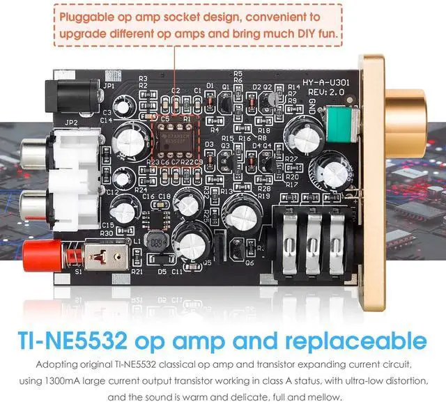 Adopting innovative circuit design, DC 5-20V wide input working voltage, the amplifier circuit can always work at a high voltage of 26V, and the background noise index is excellent. With wide frequency response extension, excellent transient response, excellent purity and transparency, and good dynamic range. ^^ Adopting original TI-NE5532 classical op amp and transistor expanding current circuit, using 1300mA large current output transistor working in class A status, with ultra-low distortion, and the sound is warm and delicate, full and mellow. ^^ Pluggable op amp socket design, convenient to upgrade different op amps and bring much DIY fun and playability for audiophiles.