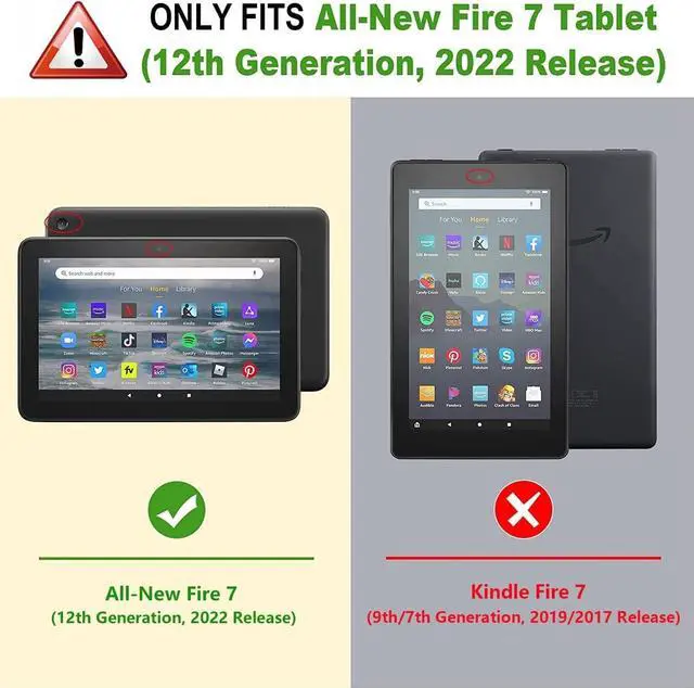 [ Compatibility ] - Specifically designed for All-New Kindle Fire 7 Tablet (7" Display, 12th Generation, 2022 Release); Not Compatible with kindle fire 7 tablet (9th/7th Generation, 2019/2017 Release), Please Check Your Device Model Before Purchase. ^^ [ Full Protection ] - Premium Synthetic leather exterior and interior offer great protection against scratches, daily use, easy to clean. Soft surface offers a good experience. Shock absorbing interior provides protection for all corners and sides of your tablet against bumps and scratches. ^^ [ Hands-Free Stand Design ] - The leather cover with fold design can make your tablet stand on the cover, The cover linning adopted anti-slip material to give your tablet a stable support, you can freely adjust the angel for a comforable viewing.