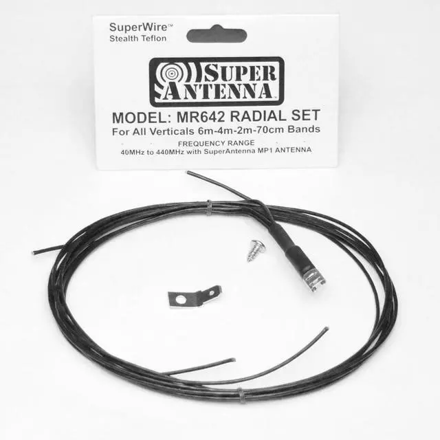 Get The Power Of A SuperWire Stealth Radial Set. The model MR642 SuperWire Radial Set provides optimum signal on the 6 meter - 4 meter - 2 meter and 70cm ham radio bands. It covers the 40 MHz to 470 MHz VHF UHF ham radio, Marine, MURS, GMRS, FRS, and scanner bands. Whether your needs are an expedition, air travel, apartment balcony, backyard, weekend get-away, indoors, field day, or an EmComm disaster relief antenna set up... this radial set fulfills the need for rapid deployment in any environment.