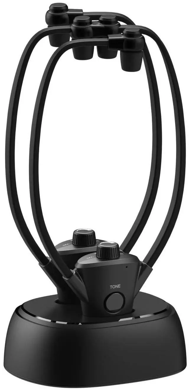 ^^ BEST IN DESIGN: Dual-Cradle and Hide-away transmitter are two separate pieces allowing you to place the dual-charging cradle right next to the bed or your favorite chair while transmitter is hidden discreetly behind the TV.