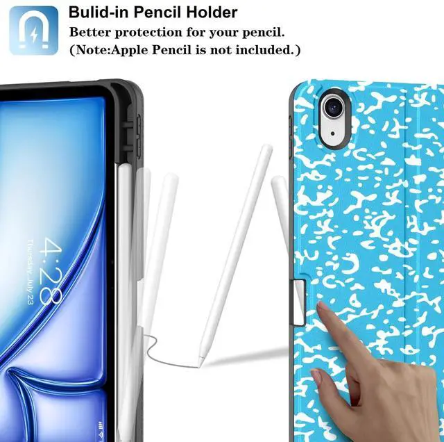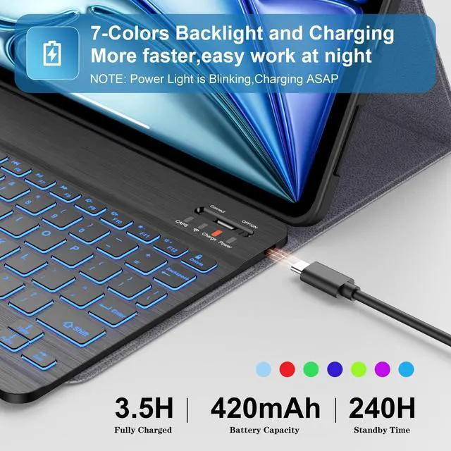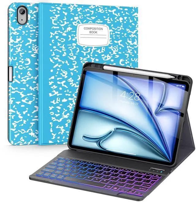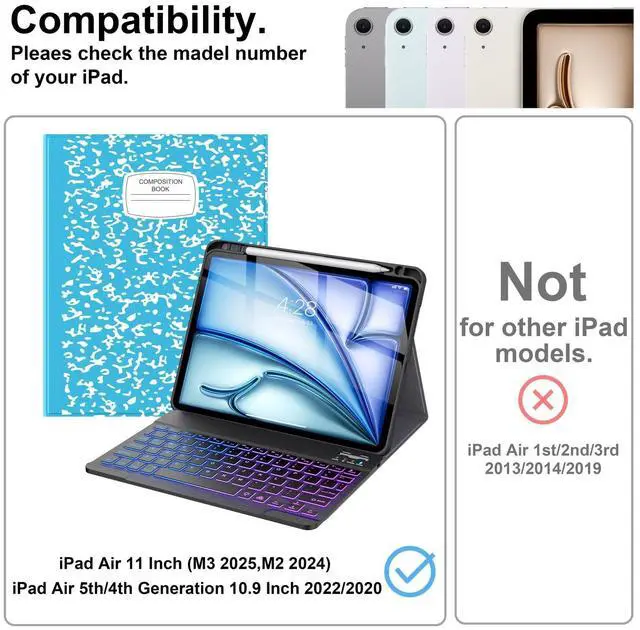 ModelsComposition notebook ipad keyboard case designed for New iPad Air 11 inch (M2/M3/M4) 2024/20252026 (Model: A2902/A2903/A2904/A3266/A3267/A3270), Air 5th/4th 10.9 inch released in 2022/2020 (Models: A2589/A2591/A2588/A2316 A2324/A2325/A2073). NOT compatible with any other iPad models. Please check back bottom of your iPad to find the model number ^^ Premium MaterialMade of flexible silicone back & TPU cover, ipad keyboard case provides full protection against shocking & scratching for your new iPad Air 11 inch (M2, M3, M5) ^^ Multi anglesAnti-slip front stand shell creates different angles for viewing or typing; magnet secures the ipad air 11 inch case closure, easy to snap on and off ^^ Magnetically DetachableThis iPad Air 11 inch (M2, M3, M4), Air 5th/4th Gen case with keyboard features a magnetic design that makes it easy to reposition the keyboard or remove it from the case. Shortcut key switching is compatible with IOS, Windows and Android. ^^ Pencil HolderBuilt-in pencil holder makes iPad Air 11 inch (M4 2026, M3 2025, M2 2024) keyboard case convenient to carry and better protect your Pencil. ^^ Backlit KeysThis iPad Air 11 inch, iPad Air 5th/4th Generation 10.9 inch keyboard case is designed with backlit keys that allow typing is more easy in dark, seven colors available with automatic color change, bringing you different visual enjoyment ^^ Rechargeable and efficient batteryHas a large battery for more energy efficiency and lower consumption.